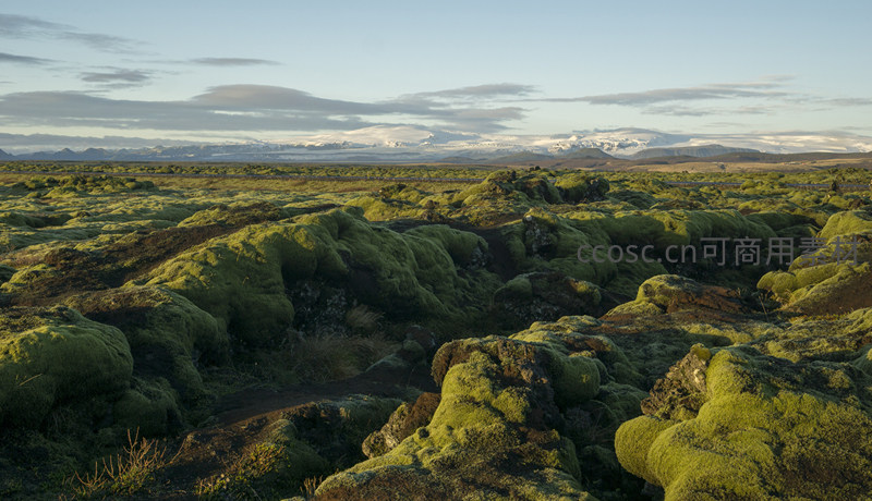 连绵起伏的苔藓地铺展至天际,背景是巍峨的雪山和淡蓝的天空,阳光洒落,勾勒出大地的纹理,展现着原始而纯净的自然生命力。