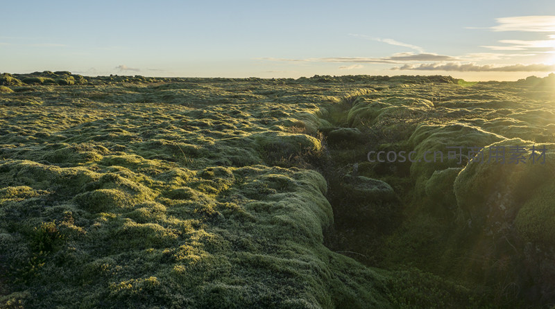 夕阳的光芒从云隙中倾泻而下,为无边无际的苔藓原野镀上一层金边,明暗交织的光影营造出温暖而神圣的氛围,令人沉醉。