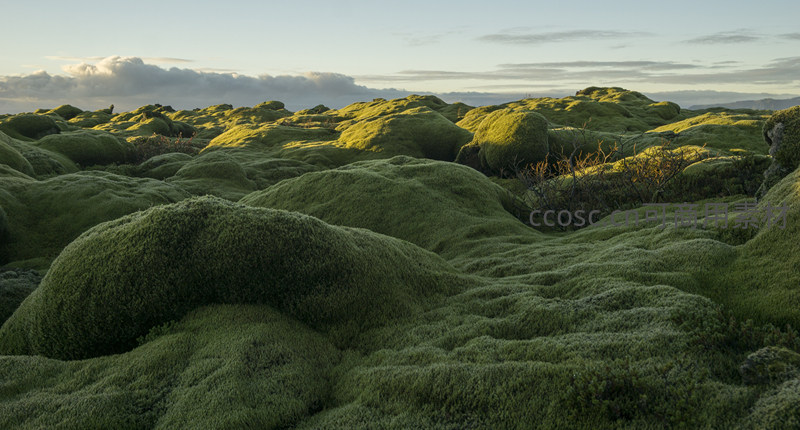 夕阳的金辉温柔地洒落在连绵起伏的苔藓丘陵上,光影交错间凸显其柔美纹理,营造出梦幻般的自然氛围。