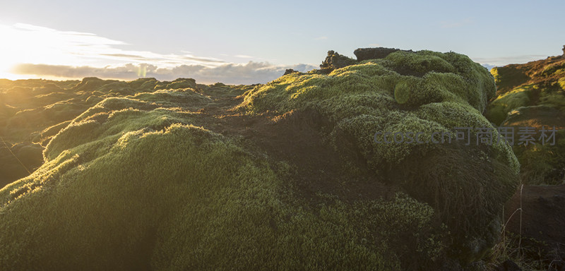 镜头聚焦于被苔藓温柔包裹的火山岩表面,细腻的绒毛质感与粗糙岩石形成鲜明对比,呈现生命与地质的奇妙融合。