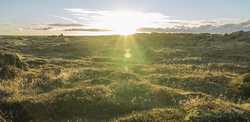 无垠的苔藓原野延伸至天际,落日熔金,光束穿透云层洒向大地,营造出辽阔、静谧且充满诗意的黄昏景象。