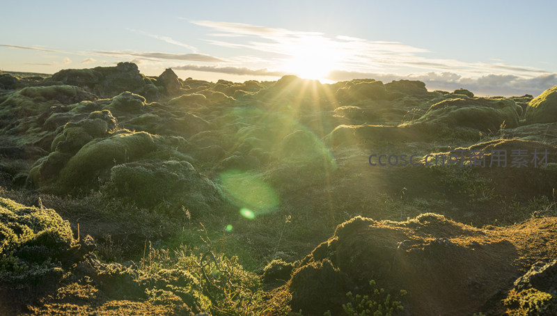 强烈的逆光穿过稀疏植被,在布满苔藓的火山岩间投下斑驳陆离的光斑,为这片原始地貌增添了一抹魔幻色彩。