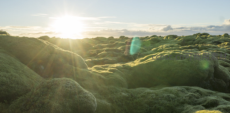 柔和的日光从地平线倾泻而下,照亮了无垠的苔藓覆盖地貌,起伏的地形如同铺开的绿色绒毯,在光影交织中散发出原始而宁静的生命气息。