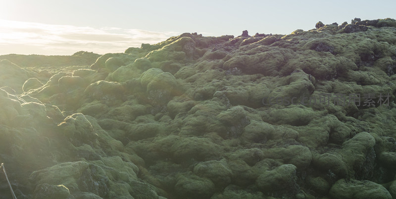 苔藓覆盖的火山岩在夕阳下熠熠生辉