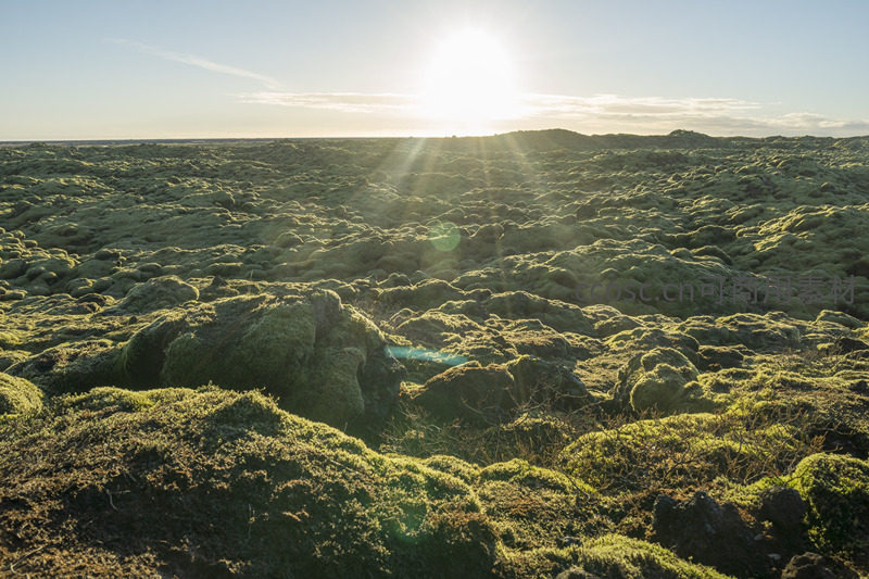 一望无际的苔藓地貌在清晨的阳光下延伸至远方的地平线,金黄的光线勾勒出每一块岩石的轮廓,展现大自然的壮丽与静谧。