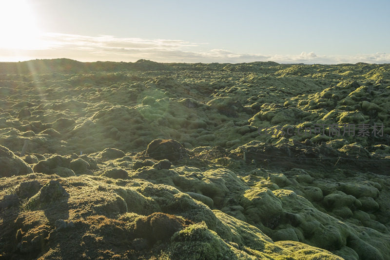 清晨的第一缕阳光斜照在古老的火山地貌上,苔藓覆盖的岩石表面光影交错,明暗对比强烈,突显了地形的纹理与生命的律动。