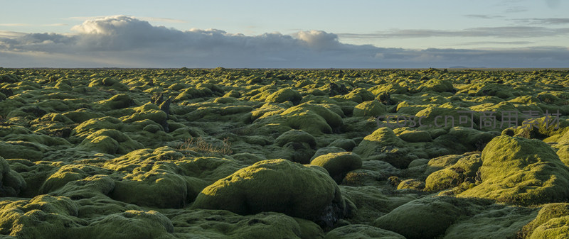 厚重云层投下斑驳阴影,轻抚覆盖苔藓的火山原野,天地之间绿意与灰蓝交融,展现出大自然恢弘又细腻的视觉交响。