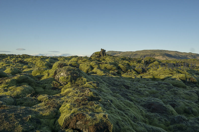 无垠的苔藓覆盖大地,一块孤石静立其中,背景是清澈的蓝天与远山,营造出空旷、静谧且充满自然力量的视觉感受。