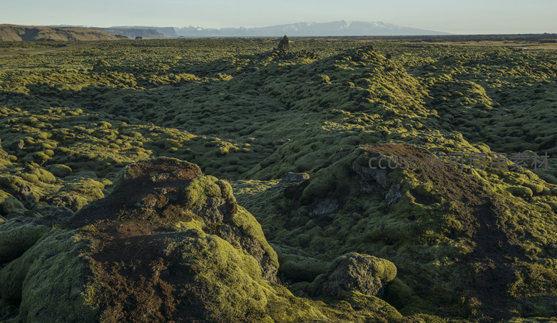从高空俯瞰,无垠的苔藓如绿色绒毯铺满大地,远处山脉连绵,勾勒出一幅宁静而壮阔的自然画卷。