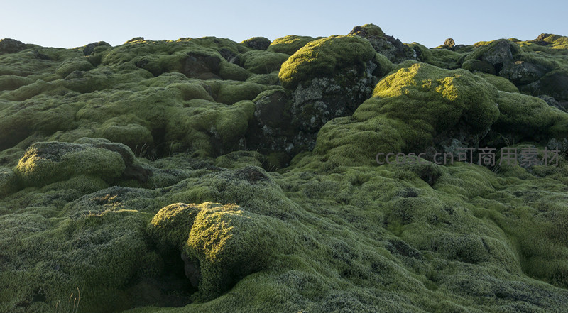 近距离捕捉阳光照射下苔藓山丘的细腻质感,每一簇绿色都饱含生机,突显了微观世界中自然之美与生命的律动。