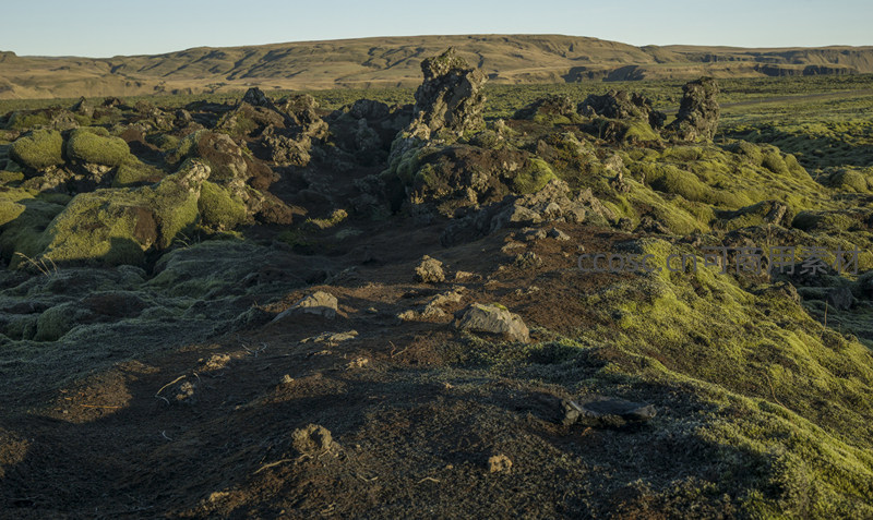 辽阔的苔原覆盖着古老火山岩,远处山峦连绵,近处小径蜿蜒,呈现荒凉中蕴含无限生机的独特地貌与壮丽视野。