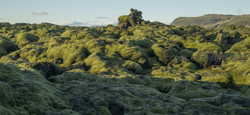 广阔无垠的苔藓地延伸至远方,背景是连绵起伏的山峦和清澈天空,构成一幅宁静而壮丽的自然画卷。