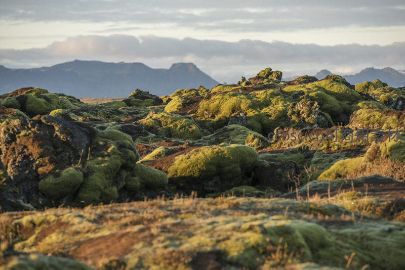 广袤的火山岩被浓密苔藓温柔覆盖,在柔和晨光下泛着生机勃勃的绿意,远处山峦朦胧,构成一幅静谧而壮丽的自然画卷。