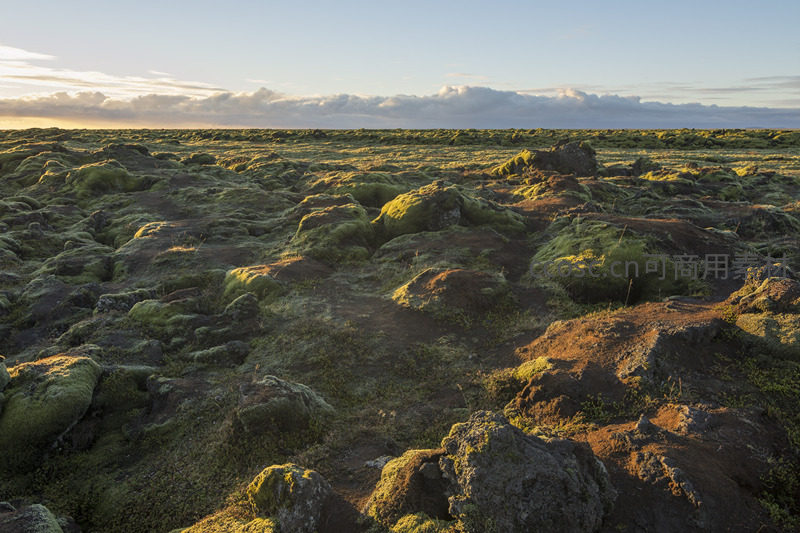 夕阳西下,金色余晖为无边无际的苔藓原野镀上暖色,深浅不一的绿与褐交织,远方地平线与云层相接,营造出辽阔而诗意的黄昏景致。