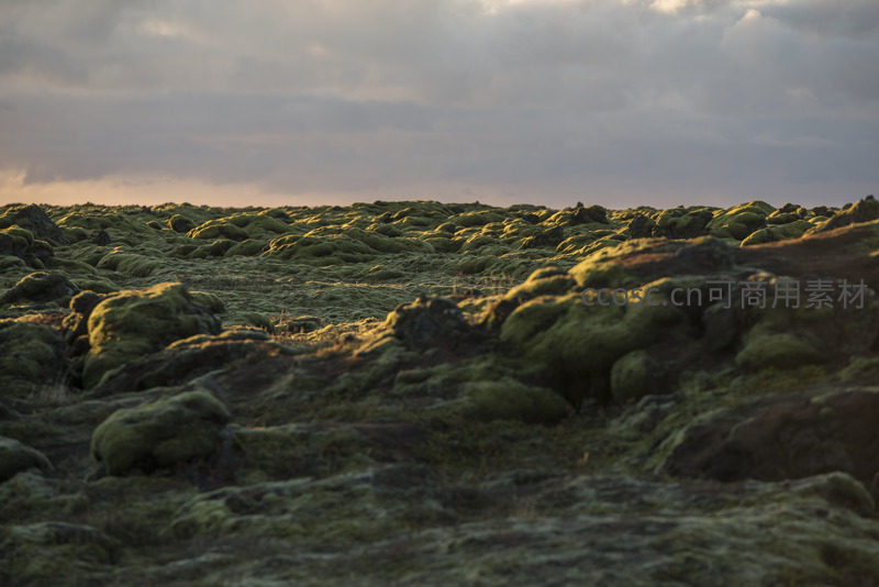 暮色中苔藓熔岩地宛如沉睡的绿色巨兽