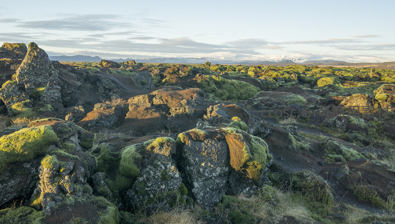 在柔和的晨光下,大片黑色火山岩被鲜绿的苔藓温柔覆盖,远处雪山与云层相接,构成一幅宁静而壮阔的原始自然画卷。