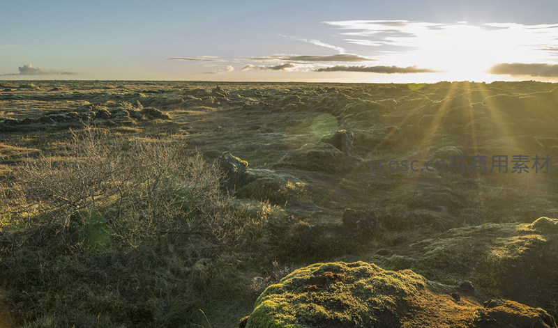 金色夕阳从云隙间倾泻而下,光束穿透稀疏灌木,温柔抚过布满苔藓的火山岩,为这片荒芜之地披上温暖而神圣的光辉。