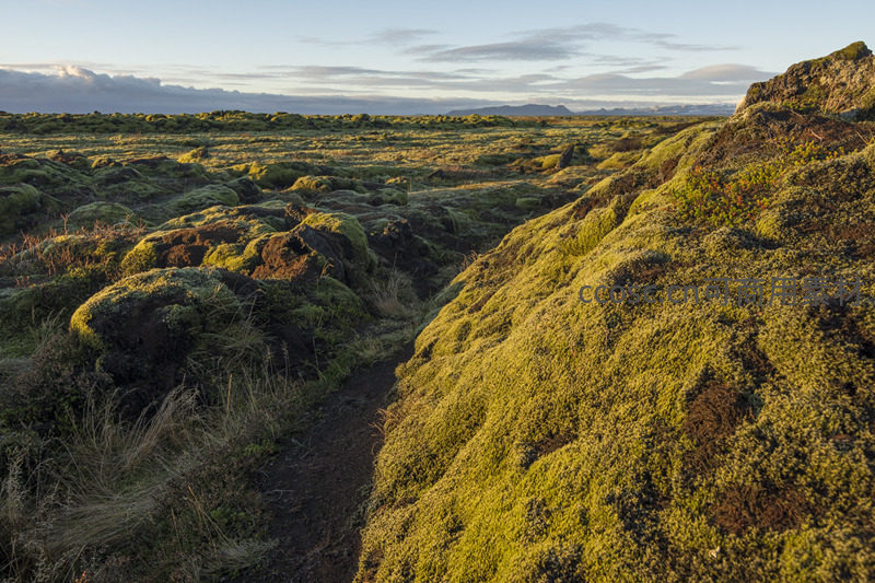 一条泥土小径蜿蜒穿过被浓密苔藓覆盖的熔岩峡谷,金色阳光为绿色世界镀上暖调,营造出静谧而充满探索感的氛围。