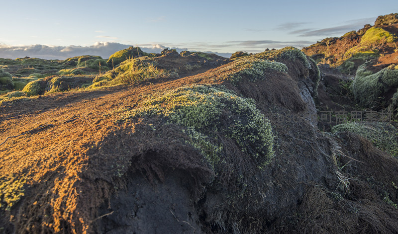 特写镜头展示火山岩断面,苔藓、腐殖土与裸露岩层形成鲜明色彩与质感对比,揭示大地深处的生命循环与时间痕迹。