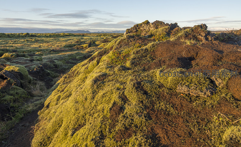 苔藓覆盖的火山岩地貌在夕阳下熠熠生辉