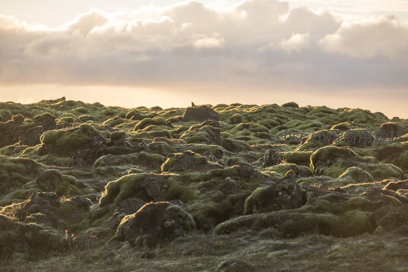连绵起伏的苔藓丘陵沐浴在金色霞光里
