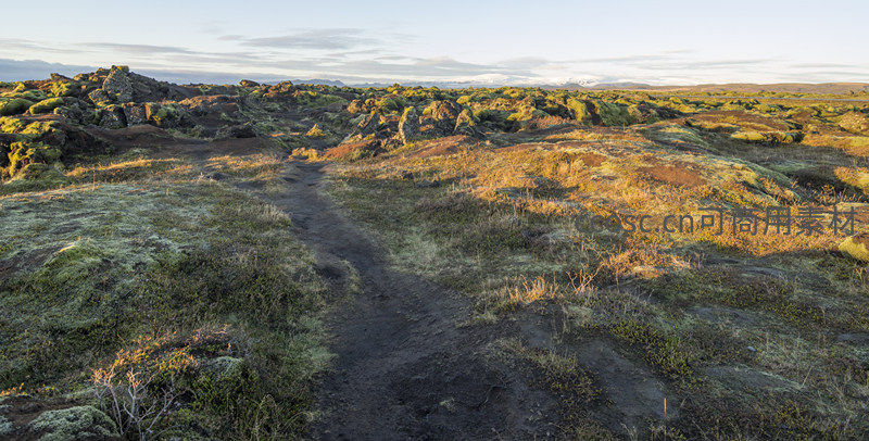 一条蜿蜒的小径穿过被绿色苔藓覆盖的黑色火山岩,夕阳余晖洒在起伏的地表上,营造出宁静而原始的自然氛围。