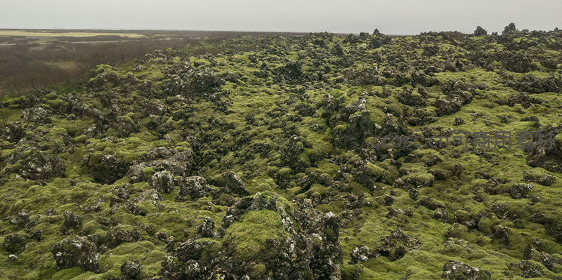 从高空俯瞰,连绵起伏的熔岩地貌被浓密苔藓覆盖,形成一片绿色海洋,展现地球地质奇观与生态复苏的力量。