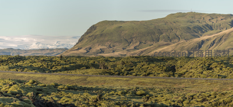一条笔直的公路横贯布满苔藓的平原,背景是连绵起伏的绿色山丘和远处白雪皑皑的山峰,展现了冰岛独特而宁静的自然风貌。