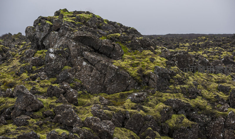 在阴沉天空下,黑色火山岩被鲜绿苔藓温柔包裹,湿漉漉的表面反射微光,展现出粗犷与柔美并存的自然肌理与生命力。