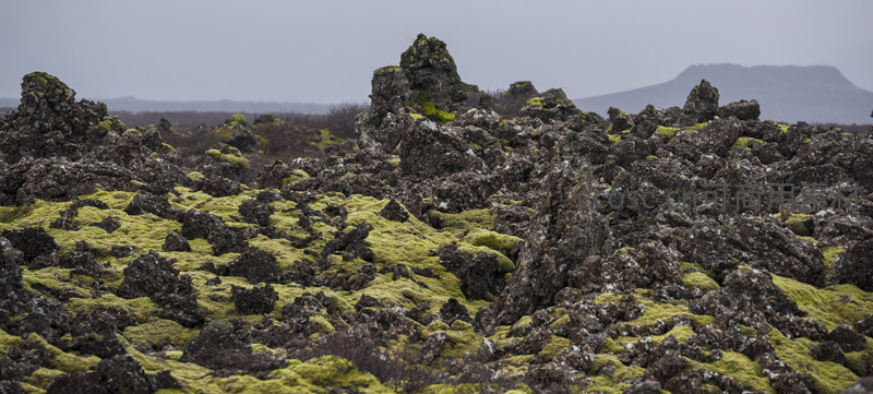 在苍茫的苔藓熔岩平原上,几座被苔藓包裹的岩柱突兀耸立,背景是朦胧远山,营造出一种原始、孤寂而又庄严的自然氛围。