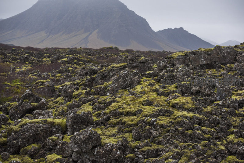 广袤的黑色火山岩被鲜绿苔藓温柔覆盖,远处山峦在薄雾中若隐若现,构成一幅原始而宁静的自然画卷。