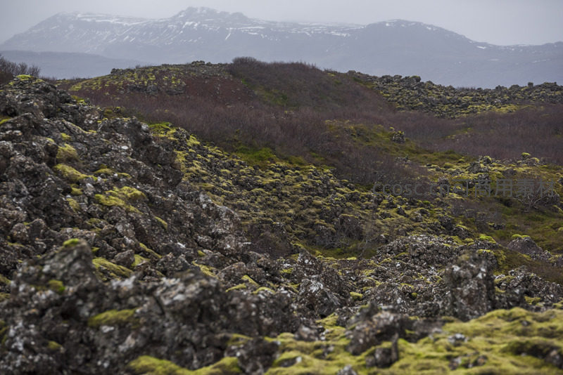 前景是布满青苔的嶙峋熔岩,中景是起伏的灌木坡地,远景是白雪皑皑的山脉,层次分明,展现大地的粗犷与柔美。