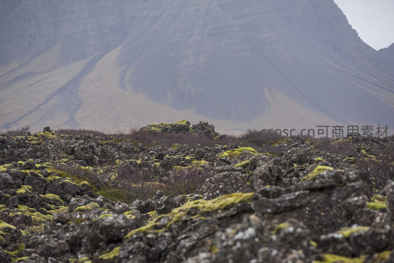 苔藓覆盖的火山岩与远山构成的荒野景观