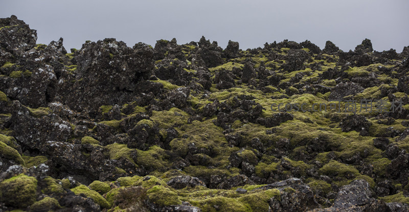 深色的火山岩层与蓬松的绿色苔藓形成强烈视觉对比,绵延起伏的地貌如同大地的肌肤,展现了地质变迁与生态演替的无声力量。