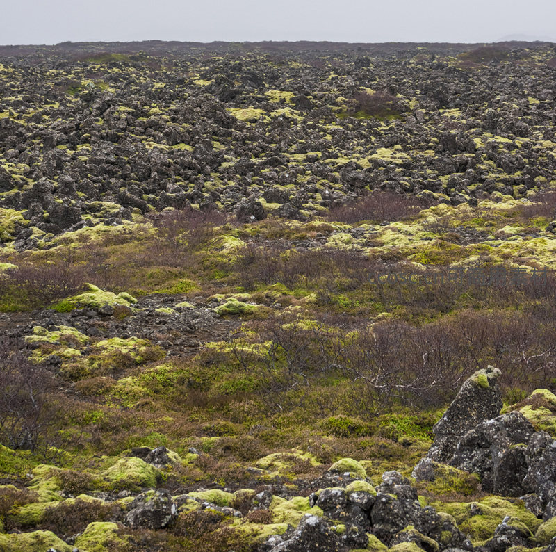 崎岖的火山岩与柔嫩苔藓交织成画,远处低矮灌木点缀其间,构成一幅粗犷与细腻并存的大地艺术作品。