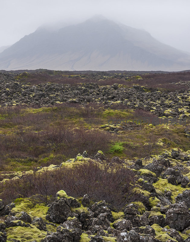 云雾缭绕的远山背景下,近处是布满青苔的火山岩,营造出如梦似幻的仙境氛围,令人感受到自然的壮阔与宁静。