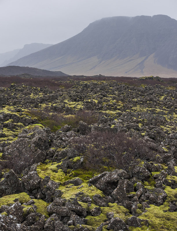 连绵山脉环抱着布满苔藓的火山岩地带,层次分明的景致展现出大地的沧桑与生机,是自然力量与时间雕琢的杰作。