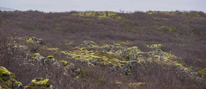 广袤苔原上,火山岩与低矮灌木交织共生,绿色苔藓与褐色枝条构成大地的肌理,呈现原始生态系统的静谧之美。