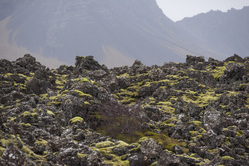 崎岖不平的黑色熔岩地上,顽强生长的绿色苔藓形成鲜明对比,背景是连绵起伏的灰色山脉,尽显大自然的粗犷之美。