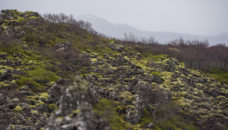 从低处仰望,火山岩坡地被翠绿苔藓层层覆盖,与枯枝和远山共同构成层次丰富的自然画面,充满野性与生命力。