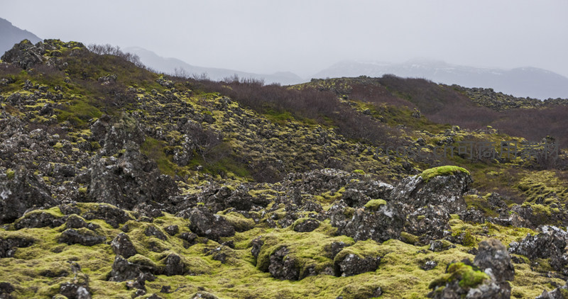 起伏的山丘上遍布嶙峋黑石,其上铺满柔软的绿色苔藓,与背景中朦胧的远山共同构成一幅苍凉又充满生命力的画面。