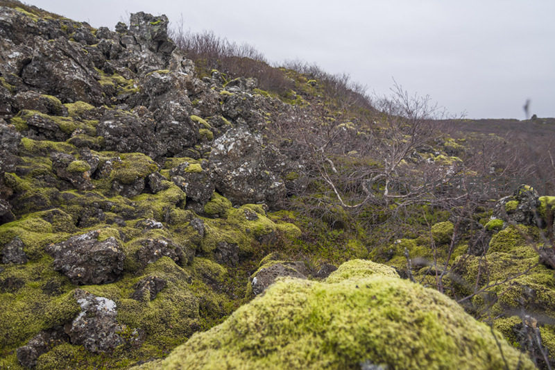 前景是蓬松的绿苔覆盖着粗粝岩石,后方几株光秃的灌木在风中静立,整个画面弥漫着一种原始、静谧且略带萧瑟的自然气息。