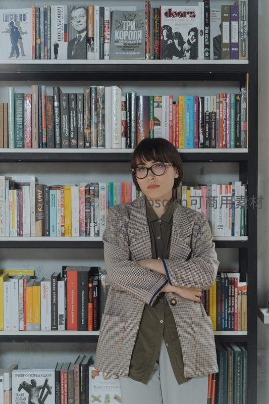 一位戴着眼镜、穿着格子西装外套的女性,双臂交叉站在满是书籍的书架前,神情专注而沉静。