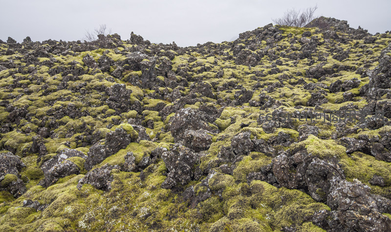 大片深色火山岩被鲜绿苔藓温柔覆盖,形成独特的自然纹理,在灰白天空下展现原始而宁静的生命力。