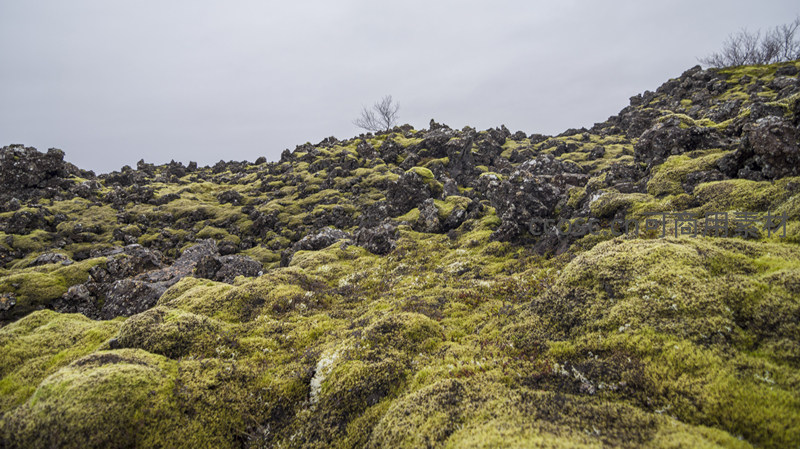 在广阔苍茫的天地间,火山岩坡上蔓延的绿色苔藓如同奇迹般点缀着荒芜,营造出一种宁静而震撼的视觉美感。