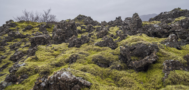 黑色粗糙的熔岩块与柔软的绿色苔藓交织,构成一幅充满对比与生命力的画面,展现了冰岛独特而苍凉的自然环境之美。