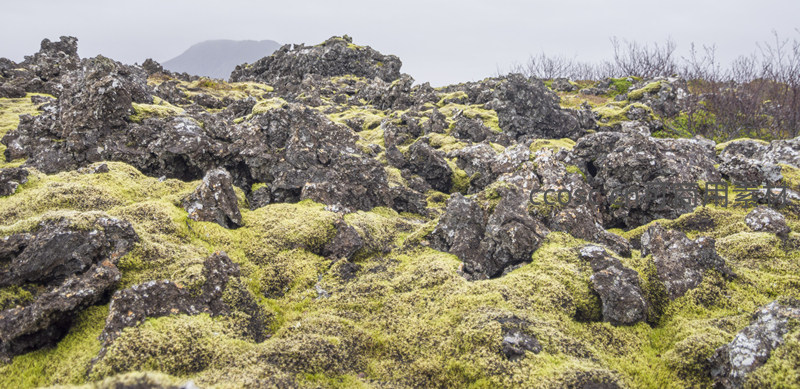 大片深色火山岩被鲜绿苔藓温柔覆盖,形成独特的纹理与色彩对比,展现原始而宁静的自然力量。