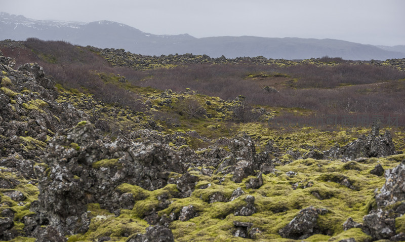 前景是布满苔藓的熔岩块,中景是枯黄灌木丛,远景是朦胧雪山,构成层次丰富的荒原画卷,静谧而辽阔。