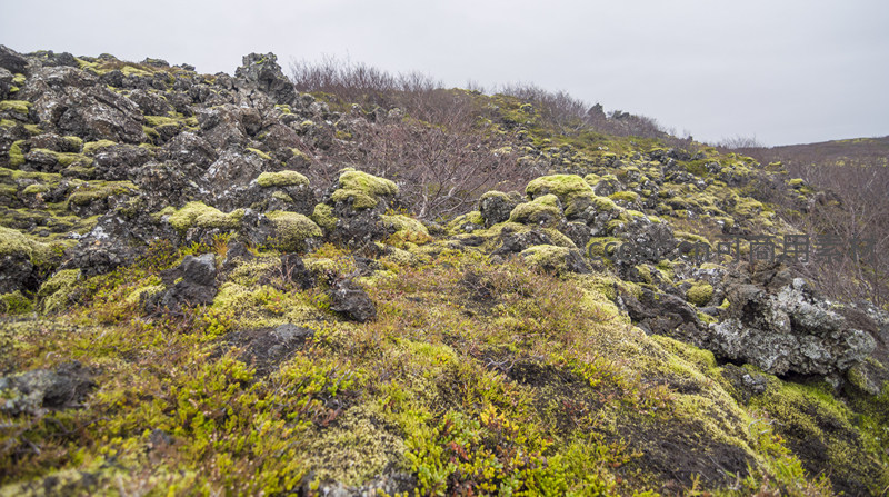 崎岖不平的山丘上,深色火山岩被鲜亮的青苔温柔包裹,展现出大地粗犷与柔美的奇妙融合。