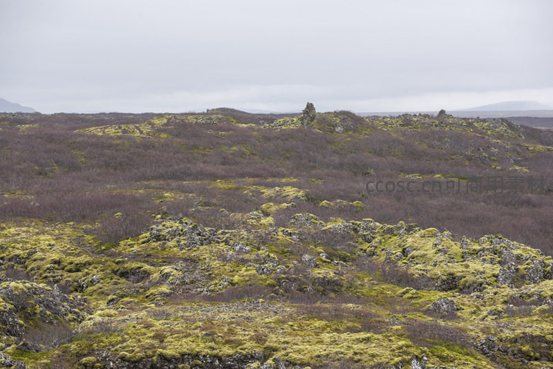 在阴沉天空下,连绵的火山丘陵被苔藓染成斑驳的绿褐,远处山峦隐约,尽显原始地貌的苍凉之美。